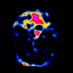 Click on sagittal image to select slice. Click on thin tickmark to change timepoint, or thick tickmark for overlay.