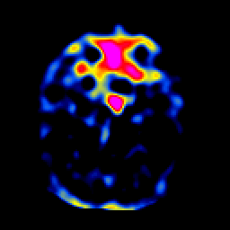 Click on sagittal image to select slice. Click on thin tickmark to change timepoint, or thick tickmark for overlay.