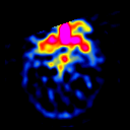 Click on sagittal image to select slice. Click on thin tickmark to change timepoint, or thick tickmark for overlay.