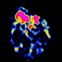 Click on sagittal image to select slice. Click on thin tickmark to change timepoint, or thick tickmark for overlay.