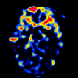 Click on sagittal image to select slice. Click on thin tickmark to change timepoint, or thick tickmark for overlay.