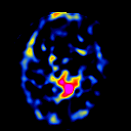 Click on sagittal image to select slice. Click on thin tickmark to change timepoint, or thick tickmark for overlay.