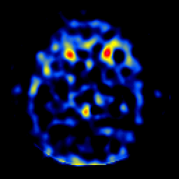 Click on sagittal image to select slice. Click on thin tickmark to change timepoint, or thick tickmark for overlay.