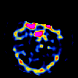 Click on sagittal image to select slice. Click on thin tickmark to change timepoint, or thick tickmark for overlay.