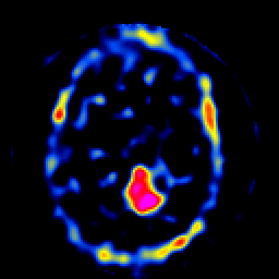Click on sagittal image to select slice. Click on thin tickmark to change timepoint, or thick tickmark for overlay.