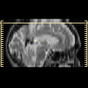 Click on sagittal image to select slice. Click on thin tickmark to change timepoint, or thick tickmark for overlay.