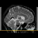 Click on sagittal image to select slice. Click on thin tickmark to change timepoint, or thick tickmark for overlay.