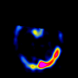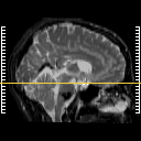 Click on sagittal image to select slice. Click on thin tickmark to change timepoint, or thick tickmark for overlay.