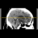Click on sagittal image to select slice. Click on thin tickmark to change timepoint, or thick tickmark for overlay.