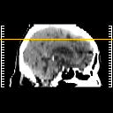 Click on sagittal image to select slice. Click on thin tickmark to change timepoint, or thick tickmark for overlay.