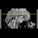 Click on sagittal image to select slice. Click on thin tickmark to change timepoint, or thick tickmark for overlay.
