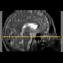 Click on sagittal image to select slice. Click on thin tickmark to change timepoint, or thick tickmark for overlay.