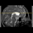 Click on sagittal image to select slice. Click on thin tickmark to change timepoint, or thick tickmark for overlay.
