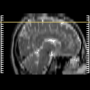 Click on sagittal image to select slice. Click on thin tickmark to change timepoint, or thick tickmark for overlay.