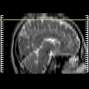 Click on sagittal image to select slice. Click on thin tickmark to change timepoint, or thick tickmark for overlay.
