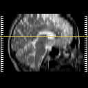 Click on sagittal image to select slice. Click on thin tickmark to change timepoint, or thick tickmark for overlay.