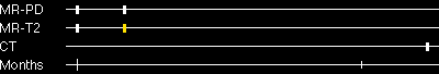 Tour 1: Next/Previous/Start: Note how the conventional T2-weighted images have converted to high signal in the lesion at four days after onset of symptoms. Compare these images with the diffusion-weighted MR images obtained acutely (below)
