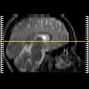 Click on sagittal image to select slice. Click on thin tickmark to change timepoint, or thick tickmark for overlay.