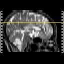 Click on sagittal image to select slice. Click on thin tickmark to change timepoint, or thick tickmark for overlay.