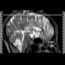 Click on sagittal image to select slice. Click on thin tickmark to change timepoint, or thick tickmark for overlay.