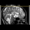 Click on sagittal image to select slice. Click on thin tickmark to change timepoint, or thick tickmark for overlay.