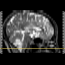 Click on sagittal image to select slice. Click on thin tickmark to change timepoint, or thick tickmark for overlay.