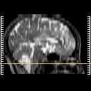 Click on sagittal image to select slice. Click on thin tickmark to change timepoint, or thick tickmark for overlay.