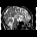 Click on sagittal image to select slice. Click on thin tickmark to change timepoint, or thick tickmark for overlay.