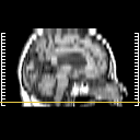 Click on sagittal image to select slice. Click on thin tickmark to change timepoint, or thick tickmark for overlay.