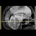 Click on sagittal image to select slice. Click on thin tickmark to change timepoint, or thick tickmark for overlay.