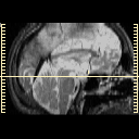 Click on sagittal image to select slice. Click on thin tickmark to change timepoint, or thick tickmark for overlay.