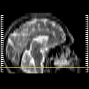 Click on sagittal image to select slice. Click on thin tickmark to change timepoint, or thick tickmark for overlay.