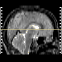 Click on sagittal image to select slice. Click on thin tickmark to change timepoint, or thick tickmark for overlay.
