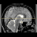 Click on sagittal image to select slice. Click on thin tickmark to change timepoint, or thick tickmark for overlay.