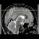 Click on sagittal image to select slice. Click on thin tickmark to change timepoint, or thick tickmark for overlay.