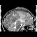 Click on sagittal image to select slice. Click on thin tickmark to change timepoint, or thick tickmark for overlay.