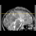 Click on sagittal image to select slice. Click on thin tickmark to change timepoint, or thick tickmark for overlay.
