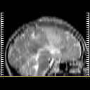 Click on sagittal image to select slice. Click on thin tickmark to change timepoint, or thick tickmark for overlay.