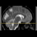 Click on sagittal image to select slice. Click on thin tickmark to change timepoint, or thick tickmark for overlay.