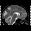 Click on sagittal image to select slice. Click on thin tickmark to change timepoint, or thick tickmark for overlay.