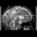 Click on sagittal image to select slice. Click on thin tickmark to change timepoint, or thick tickmark for overlay.