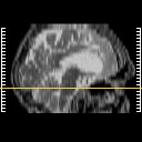 Click on sagittal image to select slice. Click on thin tickmark to change timepoint, or thick tickmark for overlay.