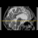 Click on sagittal image to select slice. Click on thin tickmark to change timepoint, or thick tickmark for overlay.