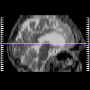 Click on sagittal image to select slice. Click on thin tickmark to change timepoint, or thick tickmark for overlay.