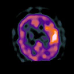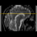 Click on sagittal image to select slice. Click on thin tickmark to change timepoint, or thick tickmark for overlay.
