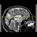 Click on sagittal image to select slice. Click on thin tickmark to change timepoint, or thick tickmark for overlay.