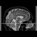Click on sagittal image to select slice. Click on thin tickmark to change timepoint, or thick tickmark for overlay.