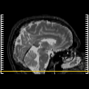 Click on sagittal image to select slice. Click on thin tickmark to change timepoint, or thick tickmark for overlay.