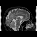 Click on sagittal image to select slice. Click on thin tickmark to change timepoint, or thick tickmark for overlay.