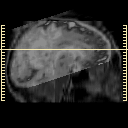 Click on sagittal image to select slice. Click on thin tickmark to change timepoint, or thick tickmark for overlay.